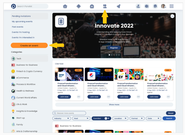 Panelist wouldn’t be as much fun if we didn’t let you create and host your own events! To do so, simply click on the ‘Events’ tab on your top page toolbar. This takes you to the Events page. To the left of this page, you’ll see the ‘Create an event’ button, colored in yellow.