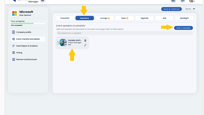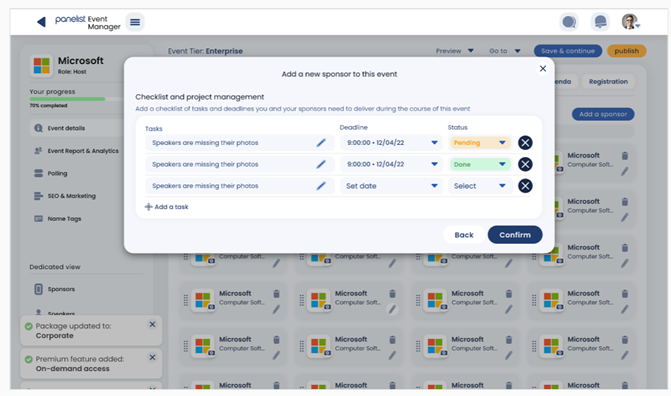 Under the ‘Check list and project management’ section, you’ll find an in-built tool to help you coordinate tasks with your sponsors. You can use this feature to communicate deadlines for when they need to provide a script for their speakers, or prepare their material for your event.