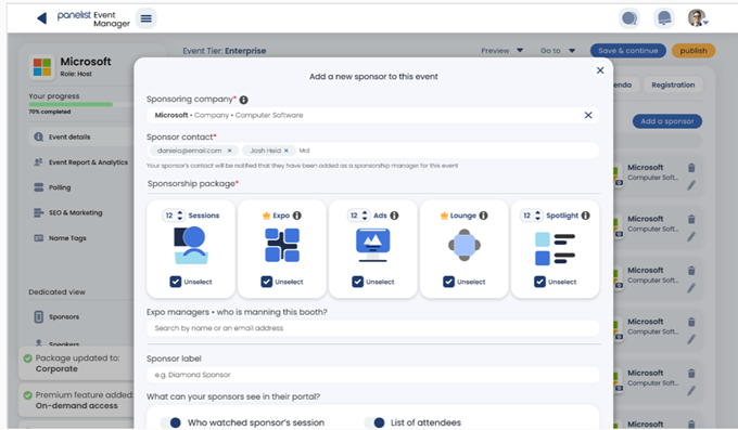 Here, you’ll be able to add global companies as sponsors for your event. Simply list the company name, and your contact representative within the first text fields. Then, select the sponsorship package that allows your sponsors to share in a specific component of your event.