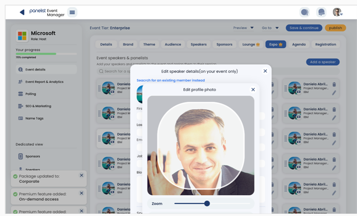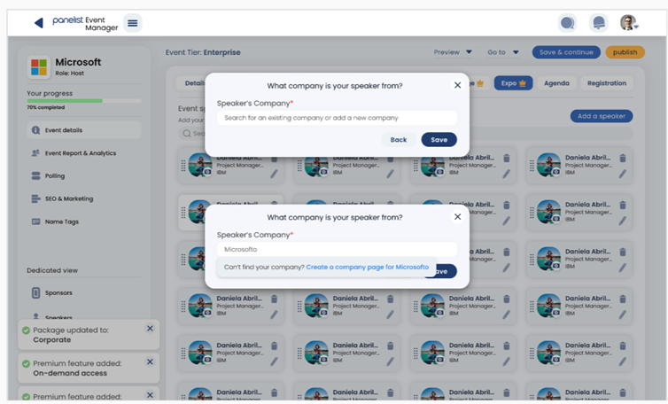 If you are managing or creating an event, the Event Manager will let you add speakers and organize their information, via the ‘Add a speaker’ function. Additionally, Panelist also features smart ways of connecting speakers and audiences — such as by letting speakers receive private questions via email, during their session.