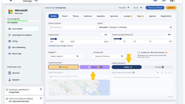 While Panelist offers an online platform for virtual event spaces, you can also customize your event according to a variety of preferences and settings. For example, you can choose between hosting a virtual or hybrid event. You can set the privacy of your event by selecting public or private next to the "virtual &hybrid event" options.